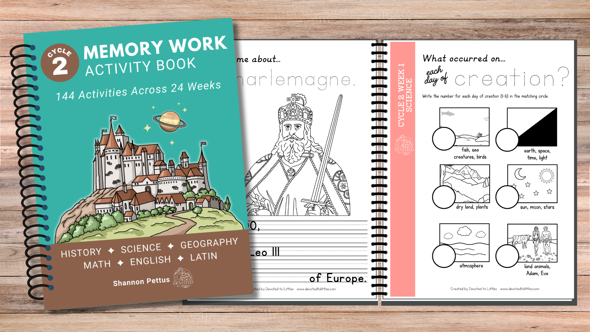 This workbook was created to give kids an easy, engaging way to practice their Cycle 2 memory work throughout the entire year. Inside, you’ll find one activity for each subject — history, science, geography, math, Latin, and English — for every week of the 24-week cycle.